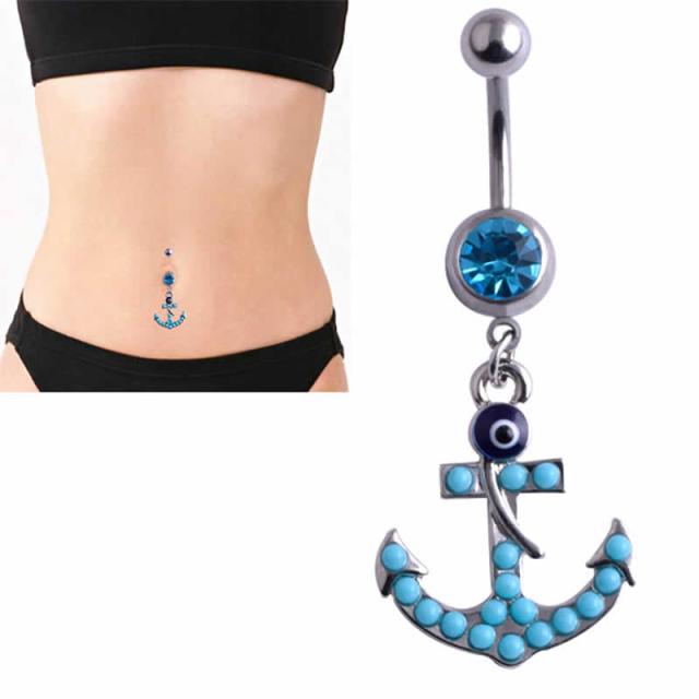 [14G おへそのピアス] ターコイズ アンカー へそピアス 14ゲージ ボディピアス ボディーピアス ヘソピアス 臍ピアス メンズ レディース サージカルステンレス316L ラインストーン ジルコニア 揺れる チャーム トルコ石 天然石風 青色 ブルー マリン 錨 イカリ 碇 船