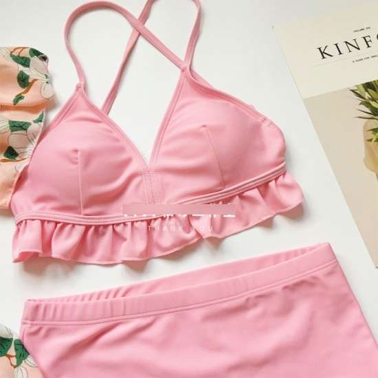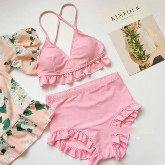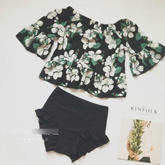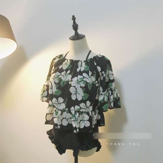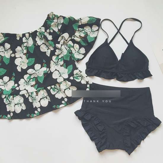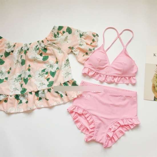 体型カバー 水着 ビキニ 3点セット 大きいサイズ レディース 2019年新作 ビーチウェア 40代 30代 20代 オフショルダー ブラウス フリル セットアップ バッククロス 無地 花柄 シンプル カバーアップ 着やせ 韓国 ママ水着 オシャレ XL 海 プール マリンスポーツ