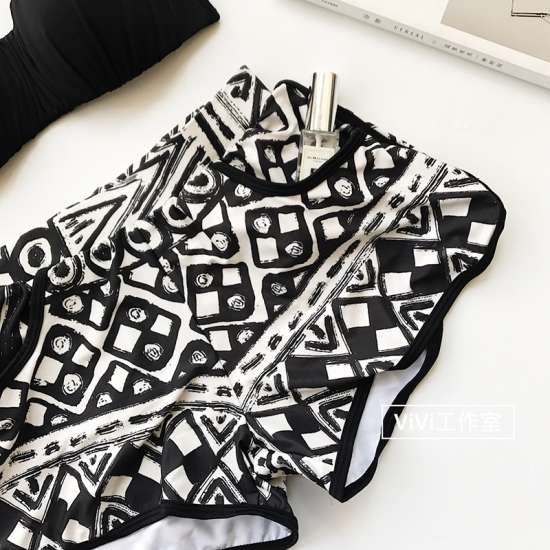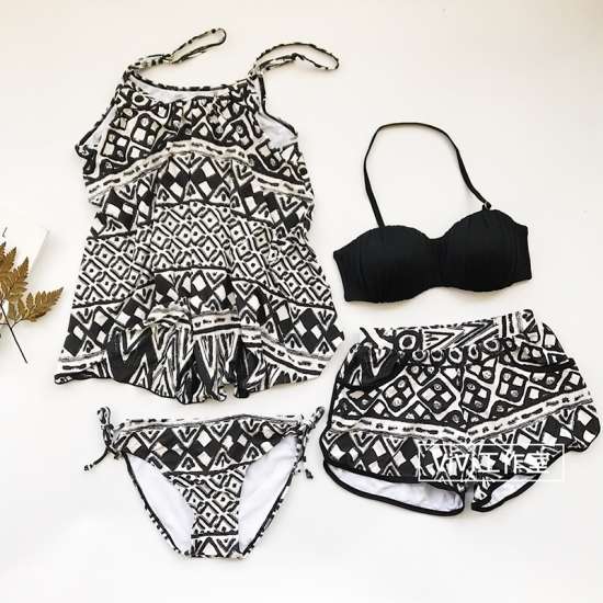 体型カバー 水着 ビキニ 4点セット 大きいサイズ レディース 2019年新作 ビーチウェア 40代 30代 バンドゥ ショートパンツ フレア セットアップ タンクトップ 幾何学 シンプル カバーアップ 着やせ 韓国 ママ オシャレ XL 海 プール マリンスポーツ ブラック レッド
