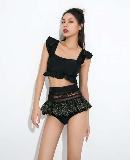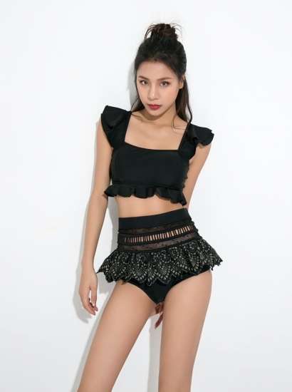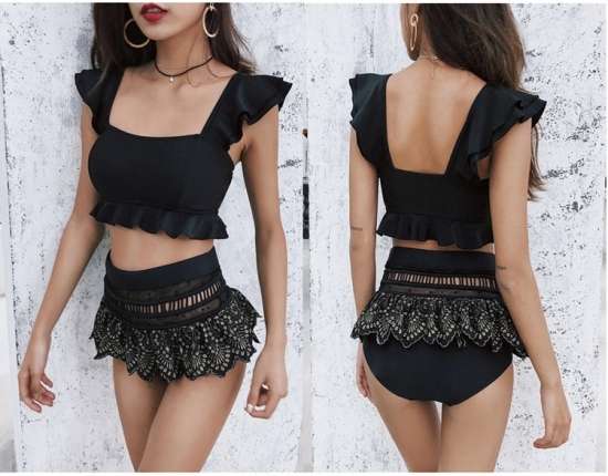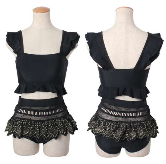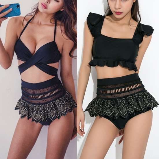 体型カバー 水着 ビキニ タンキニ 大きいサイズ レディース 2019年新作 ビーチウェア 40代 30代 20代 2パターン フリル ペプラム セットアップ レース 切替 透け感 ハイウエスト クロスデザイン 着やせ 韓国 ママ オシャレ XL 海 プール マリンスポーツ ブラック