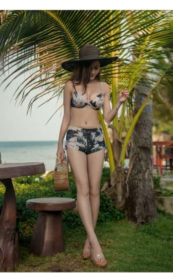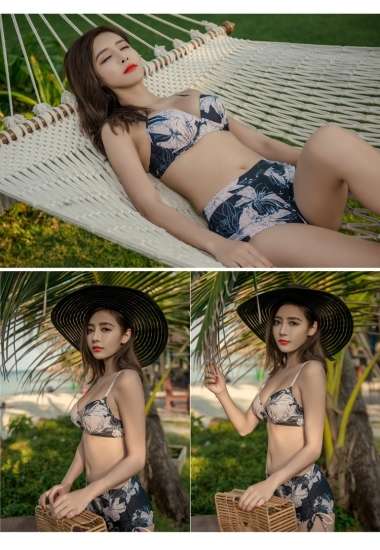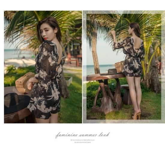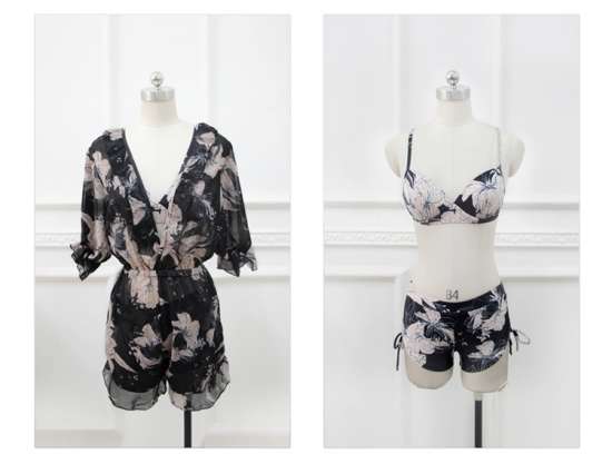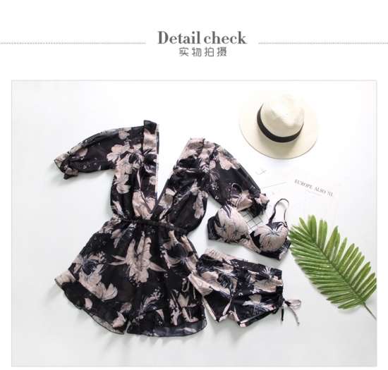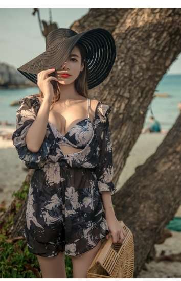 体型カバー 水着 ビキニ 3点セット 大きいサイズ レディース 2019年新作 ビーチウェア 40代 30代 20代 フレア ロンパース フリル オールインワン 花柄 ボタニカル柄 透け感 シフォン カバーアップ ハイウエスト 着やせ 韓国 ママ水着 オシャレ XL 海 プール ビーチ
