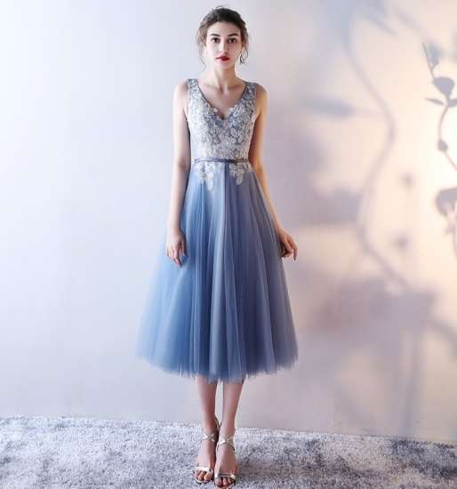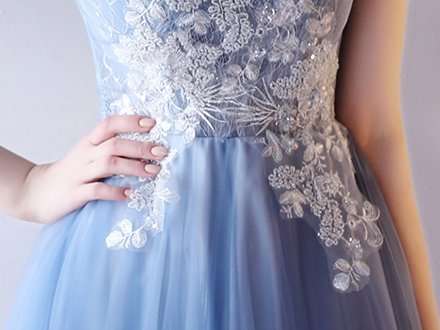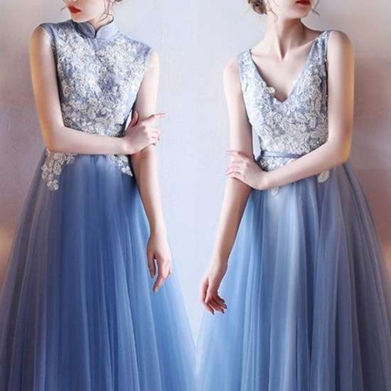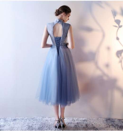パーティードレス 春夏 結婚式 大きいサイズ 30代 ミモレ丈 ノースリーブ ハイネック レース 花柄 刺繍 Aライン シフォン ブルー