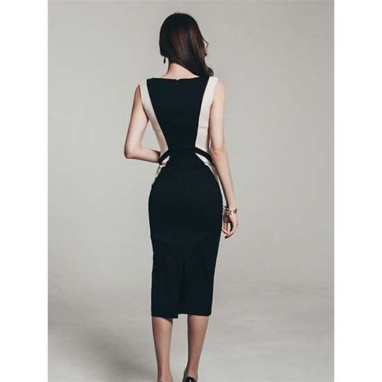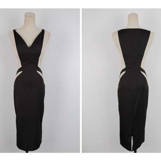 黒 スレンダーライン パーティードレス ワンピースドレス ワンピース ドレスワンピ タイトドレス お呼ばれドレス イブニングドレス 二次会 お呼ばれ デート 同窓会 食事会 ブラック バイカラー ミモレ丈 袖なし タイト 無地 Vネック 20代 30代 40代 セクシー フォーマル