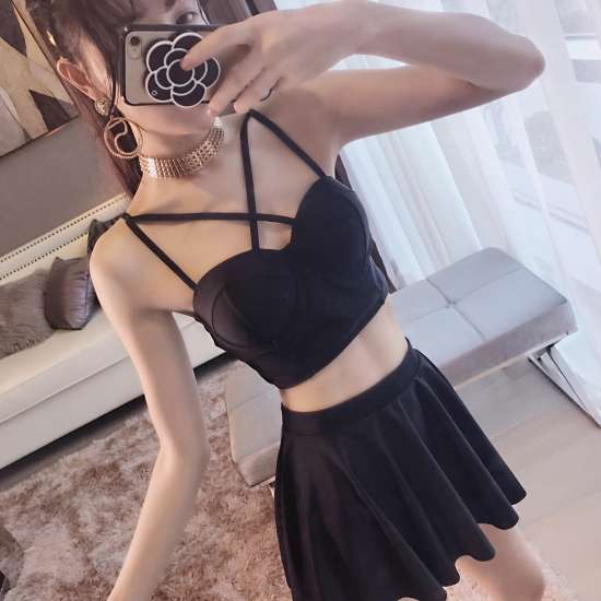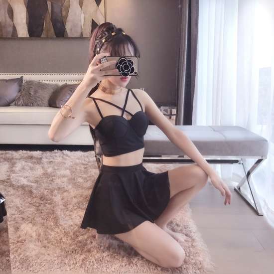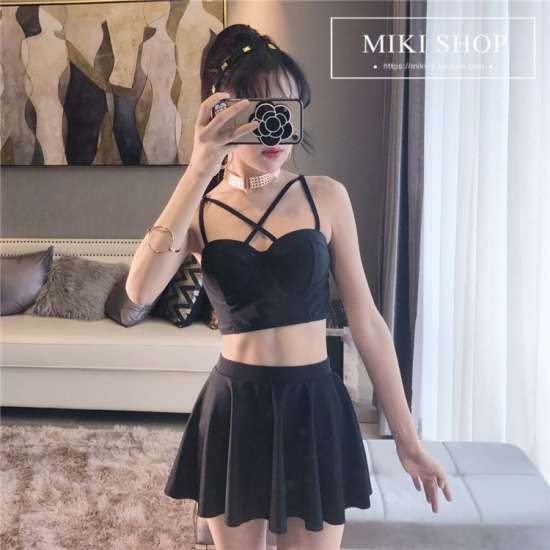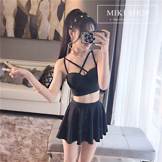 体型カバー 水着 ビキニ タンキニ ビスチェ 3点セット レディース 2019年新作 ビーチウェア 40代 30代 20代 フレアスカート フリル セットアップ 無地 バックシャン シンプル 着やせ 韓国 ママ オシャレ L 海 プール ビーチ ブラック