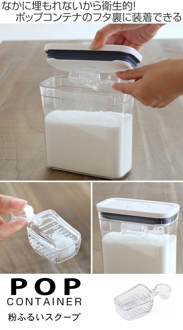 保存容器「ポップコンテナ」と合わせて使える粉ふるいスクープです。クリアな本体はポップコンテナと相性バツグン!