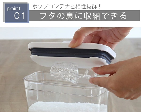 スクープの裏のくぼみを、フタ裏の突起に沿わせてスライドするだけ。フタを開けたらすぐに使うことができます。
