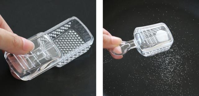 粉ふるいのフタ部分をスライドしたら、粉をすくって振るだけで、粉をまんべんなく振りかけられます。調理中、塩やコショウなどを振りかけるのにも便利です。