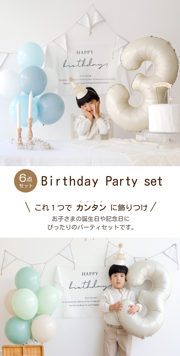 | セット内容 | ・ナンバーバルーン×2 ・タペストリー×1 ・ガーランド×1 ・バースデーハット×1 ・ゴムバルーン×9(+3予備) ・バルーンスタンド×1 |
