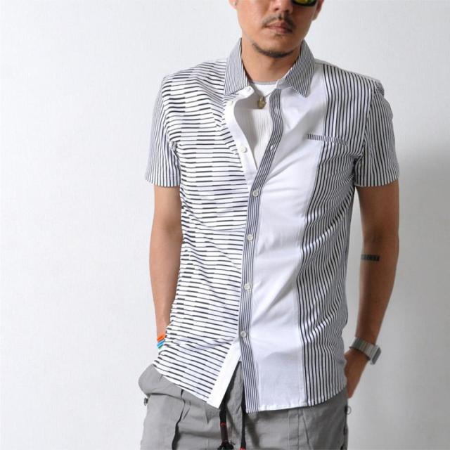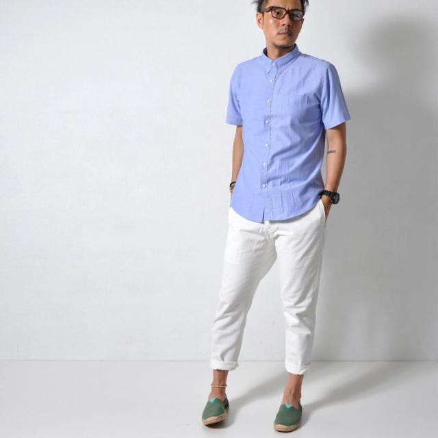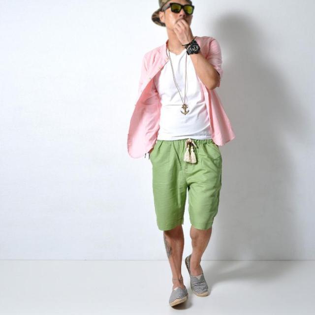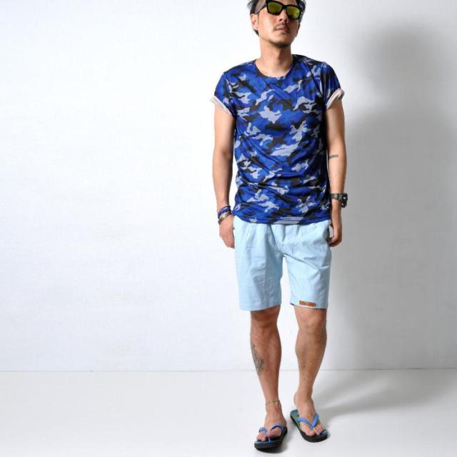 - ビジネス風ブルーのシャツ、迷彩のTシャツ、花柄の短パン、女子っぽい靴下の4点これがコーディネート? 街歩いたら笑いもんや!