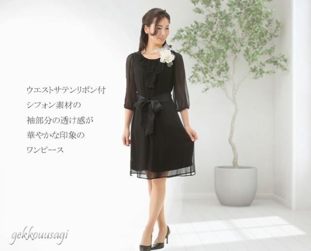 黒ワンピースは七分袖、薄手のシフォン素材。