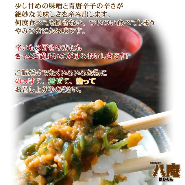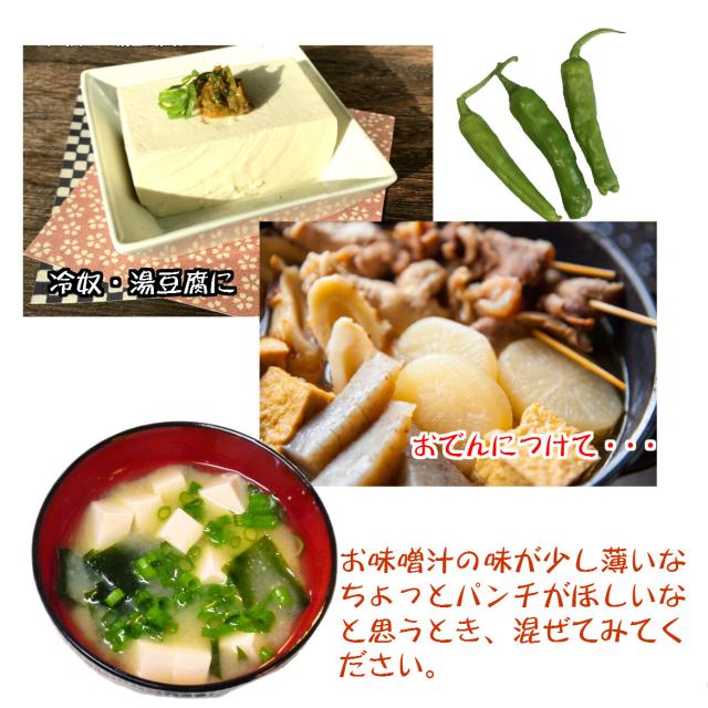 ホントに辛いのですが、少し甘めの味噌が青唐辛子と相まって何とも言えない旨味を引き出してくれます。ご飯にはもちろん、冷奴、湯豆腐、味噌汁の隠し味に、調味料としてもいろいろ使えます。リピート必至のうまいやつ!