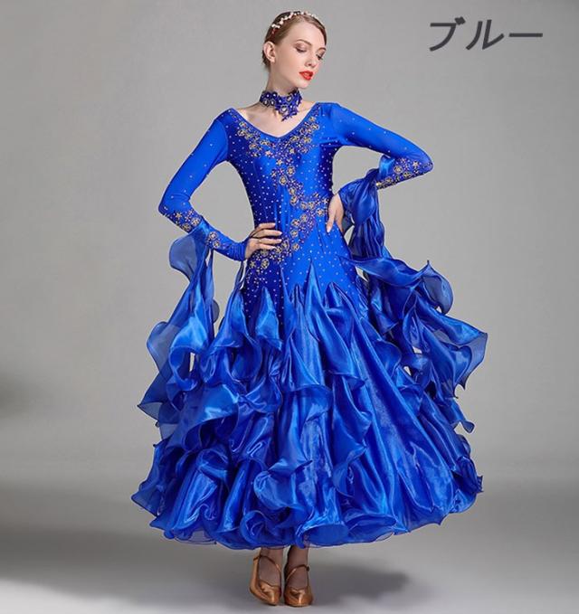 社交ダンス 衣装 モダンドレス ラテンドレス ラテン衣装 ホワイト ブルー グリーン ピンク ワインレッド 社交ダンスドレス 大きい裾 S M L XL 2XL ダンス衣装 競技着 練習服 イエロー パープル