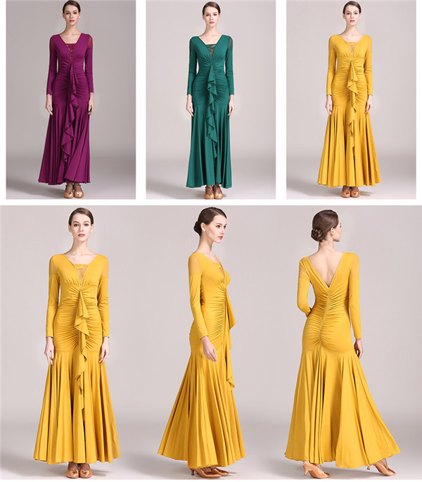 社交ダンス 衣装 モダンドレス ラテンドレス ラテン衣装 社交ダンスドレス 大きい裾 ダンス衣装 競技着 練習服 演出用 ワンピース スタンダードドレス 緑 黄 紫 ワルツダンス服dm803d3d3zk