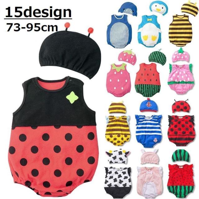 ベビー服 女の子 男の子 ロンパース カバーオール ボディースーツ ノースリーブ 帽子付き 2点セット ラウンドネック ベビー用