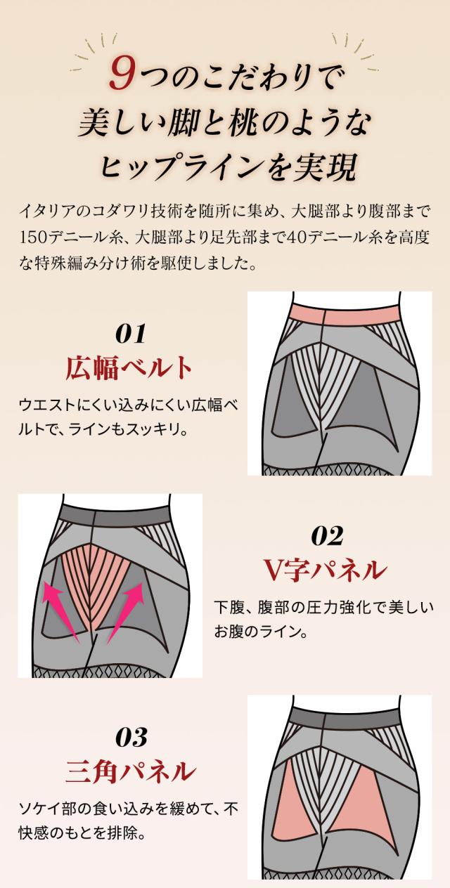 イタリアのコダワリ技術を随所に集め、大腿部より腹部まで150デニール糸