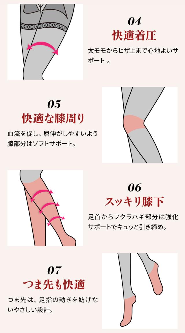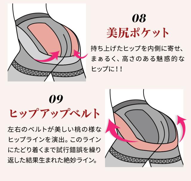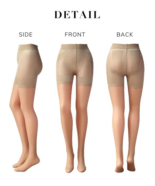 大腿部より足先部まで40デニール糸を高度な特殊編み分け術を駆使する事により、美しい足のラインと桃のような見事なヒップラインを実現。