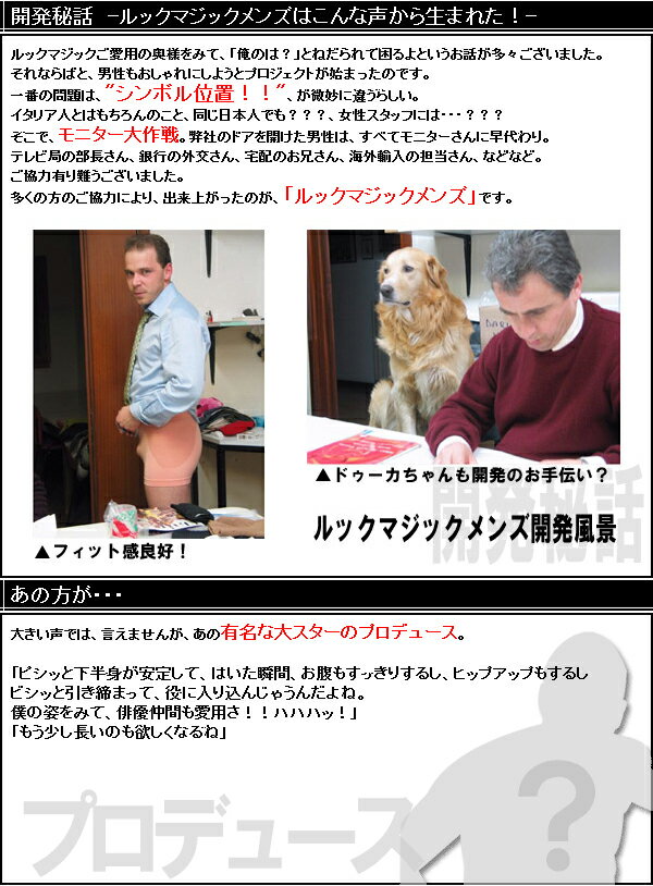 | こだわるオトコは、下着が違う トレーニングだけでは、難しい、最近目立ってきた“たいこ腹”・“たれてきたおしり”は、 ルックマジックメンズでアップするのが、もはや常識。 女性の専売特許とされてきたヒップアップベルトがついに男のものに!! 履いて動いて、キュッとお肌を履いてる間ずっーと刺激。 適度な、サポート力も見逃せない。 スーツだって、カジュアルだって、きものにだって、響かない。 アンダースパッツくらいの3分丈は、スポーツの時にも最適。 履くだけで、スーツジーンズがビシッと着こなせます。 | ||||||||||||||||