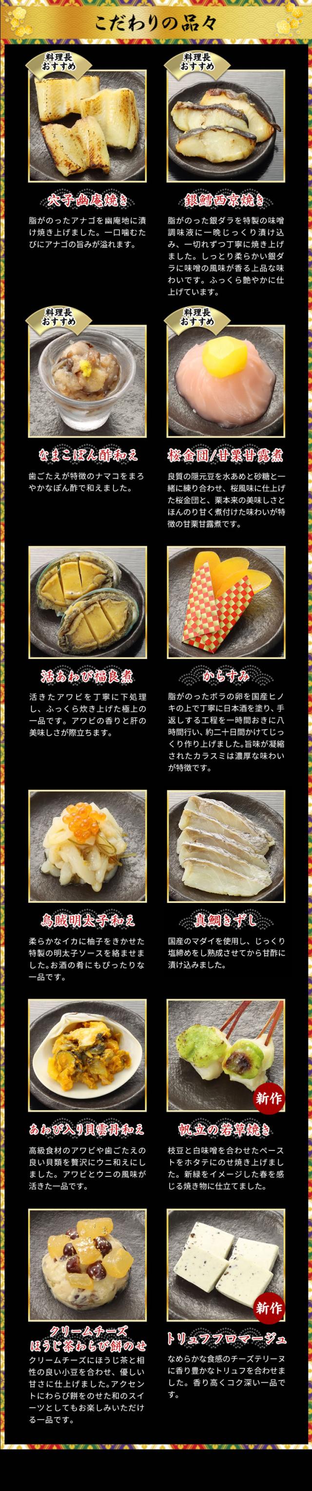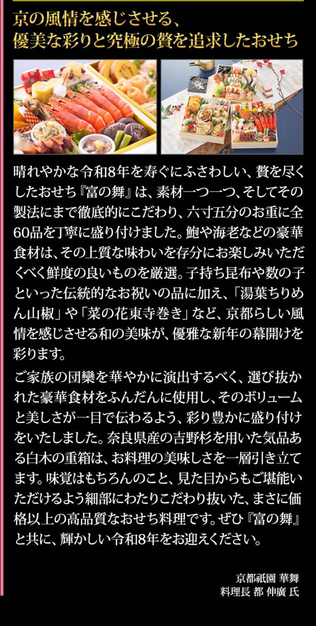 年始に“贅沢”を楽しんでいただけるよう、素材や製法にこだわったお料理を6.5寸のお重に全59品惜しみなく盛り込み、高級食材をぎっしり盛り付けた最高級のおせちに仕上げました。おせちに欠かせない定番食材のアワビや海老などは鮮度の良いものを厳選。食べ応えも十分です。祝い膳にふさわしい縁起の良い子持ち昆布や数の子はもちろん「湯葉ちりめん山椒」や「菜の花東寺巻き」のような京都らしさを感じられる和にこだわった品も盛り込んだ富の舞で優雅なお正月をお楽しみください。