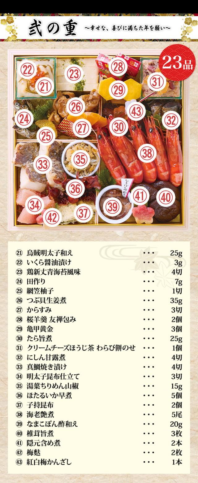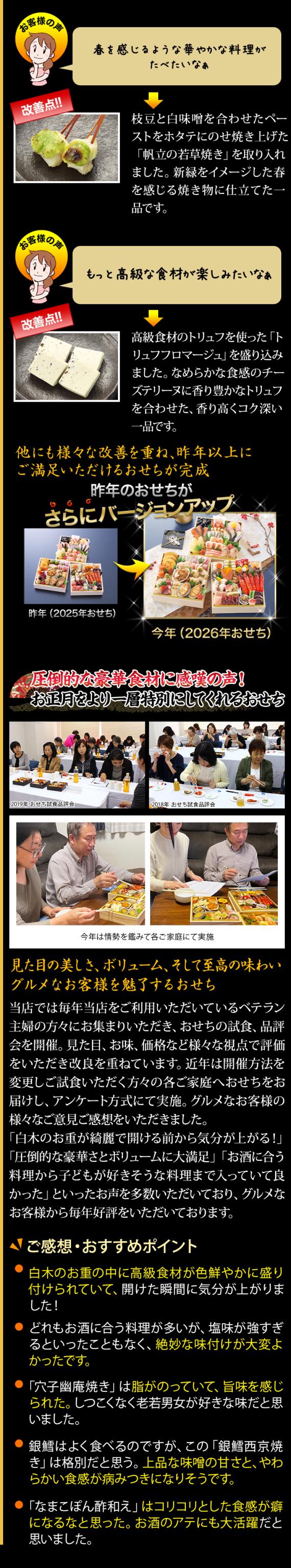 - ここ数年通販でのおせちを購入していますが今回の『富の舞』には他のおせちには入っていない魅力的な料理も数多くあり一品一品手が混んでいる感じがしました。味つけの濃過ぎることなく美味しくいただきました。この...