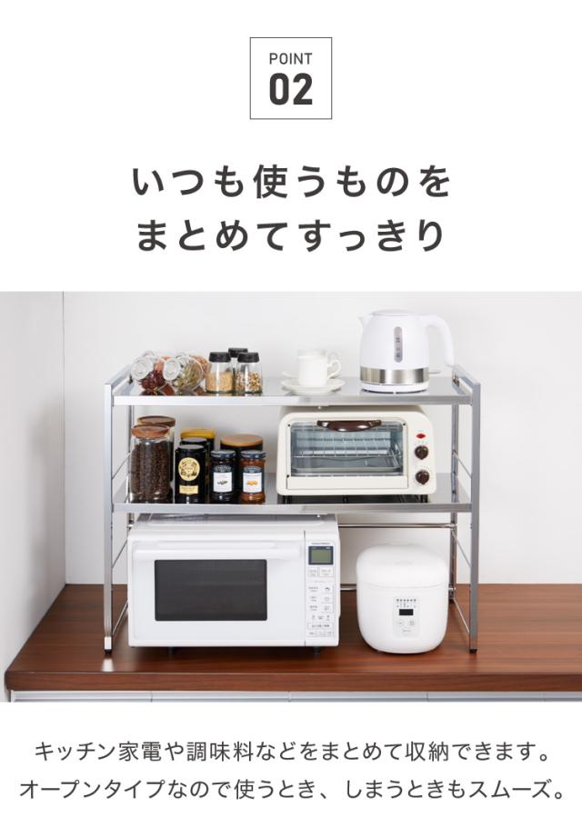 トースターや電子レンジ、オーブンレンジ等々、用途に合わせて幅を調節できるスライド式。スペースに合わせて設置できるので使いやすさも◎。
