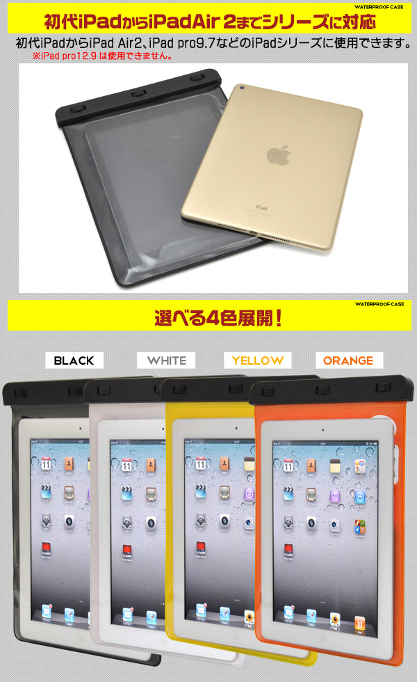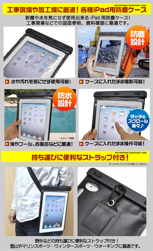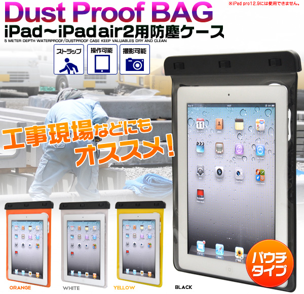 現場などでの図面参照、資料確認に最適!粉塵や水を気にせず使用出来る iPad用防塵・防水ケース! 工事現場などでの図面参照、資料確認に最適です。※パウチタイプなので強い衝撃からiPadを保護することは出来ません。初代iPadからiPad2、新しいiPad、iPad Retina、iPad Air、iPad Air2までのiPadシリーズで使用できます。※iPadPro12.9には使用できません。