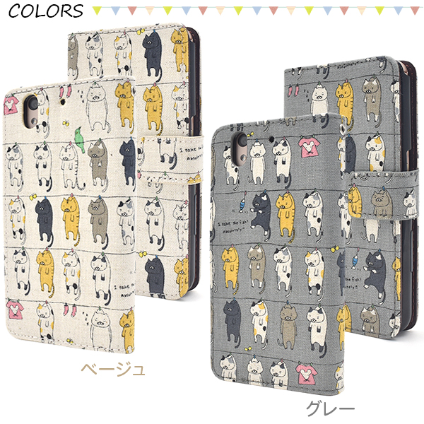 猫好きなら気に入ること間違いなし!!いっぱいの猫達が干されている柄の手帳型ケースです。ちょっとしょんぼりしている感じがして、見ていて飽きないかわいいケースです。麻を使用した生地が手触り抜群です!