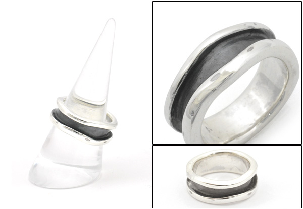 シルバーそのものの輝きと不安定な曲線がおしゃれなリングです。 黒いラインが印象を引き締めてくれます。