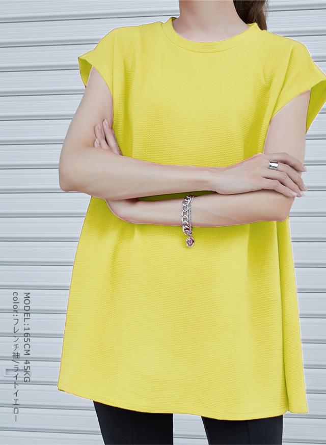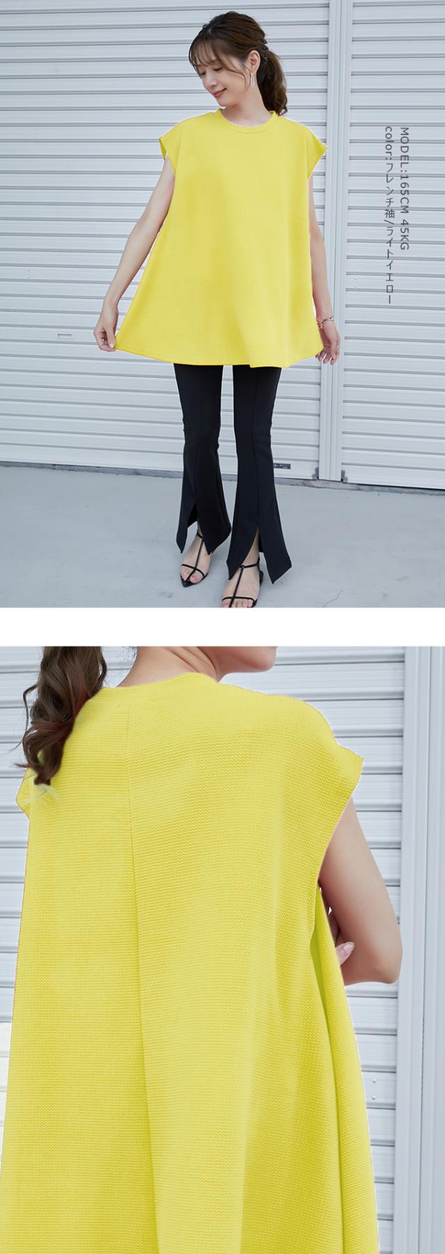 - シワにならず、ストンと落ちるAラインが体型カバーしてくれます。首周りも狭くて長さはお尻まで隠れて安心です。元気カラーのイエローなので外出の時によさそうです!