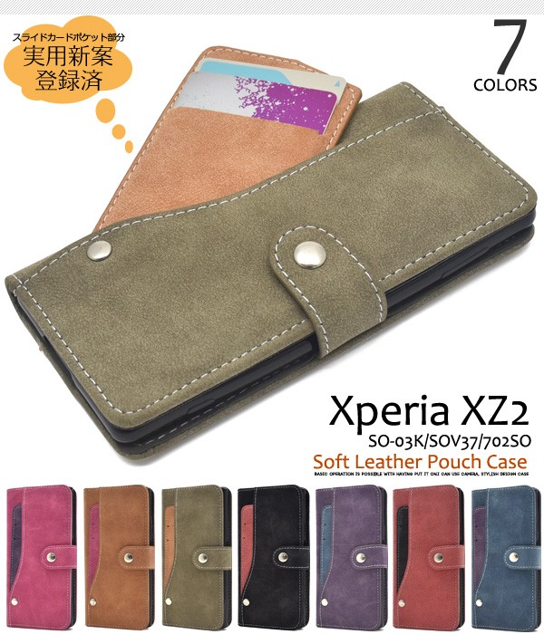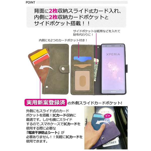 「商品情報」背面に2枚収納スライド式カード入れ、内側に2枚収納カードポケットとサイドポケット搭載した、スライドカードポケットソフトレザーケース対応機種Xperia XZ2 SO-03K SOV37 702SOピンク ブラウン グリーン ブラック パープル レッド ブルー背面にもスライド式のカードポケットを搭載!(実用新案登録済) ICカード収納に最適です。しかも横にスライドするので、スマホケースでICカードを使用する際に必要な「電波干渉防止シート」が必要ありません!!気軽にICカードを使用できます。滑らかな手触りソフトレザーデザイン。持つ度に手にしっくりと馴染みます。背面を折り返すとスタンドとして使用できるので、動画視聴に便利です。落下防止に便利なストラップホール付きです。横開きタイプなので、手帳のように使うことができま