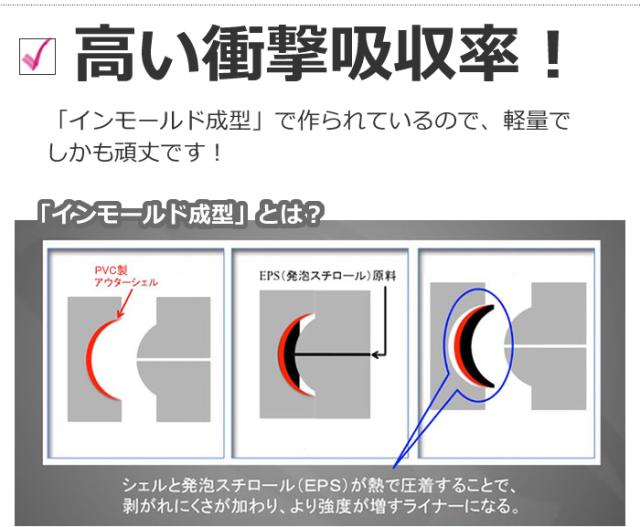 高級スポーツヘルメットで採用している『インモールド成型』で軽量・高い衝撃吸収性と耐久性を両立。