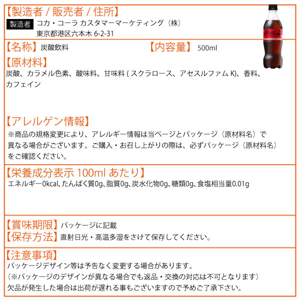 コカ・コーラ ゼロシュガー 500ml 24本 (24本×1ケース) PET 炭酸飲料(コカコーラゼロ) 送料無料