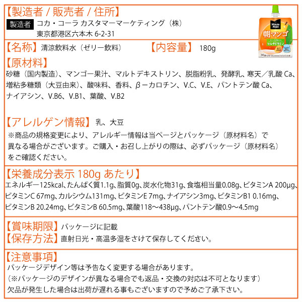 ミニッツメイド 朝マンゴ 180g 24個 (24個×1ケース) パウチ 朝食 安心のメーカー直送 送料無料