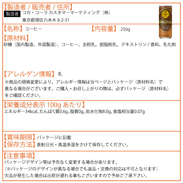ジョージア オリジナル 250g 60本 (30本×2ケース) 缶 コーヒー 安心のメーカー直送 送料無料