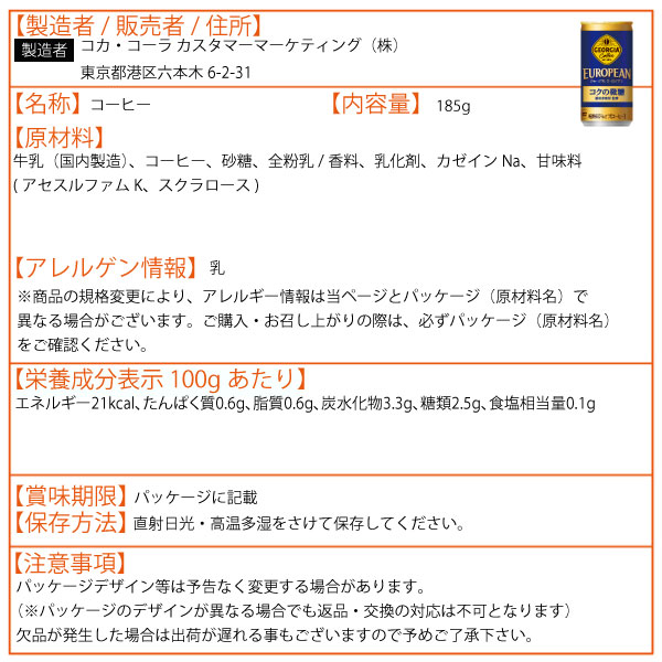 ジョージア ヨーロピアン コクの微糖 185g 60本 (30本×2ケース) 缶 コーヒー 箱 送料無料