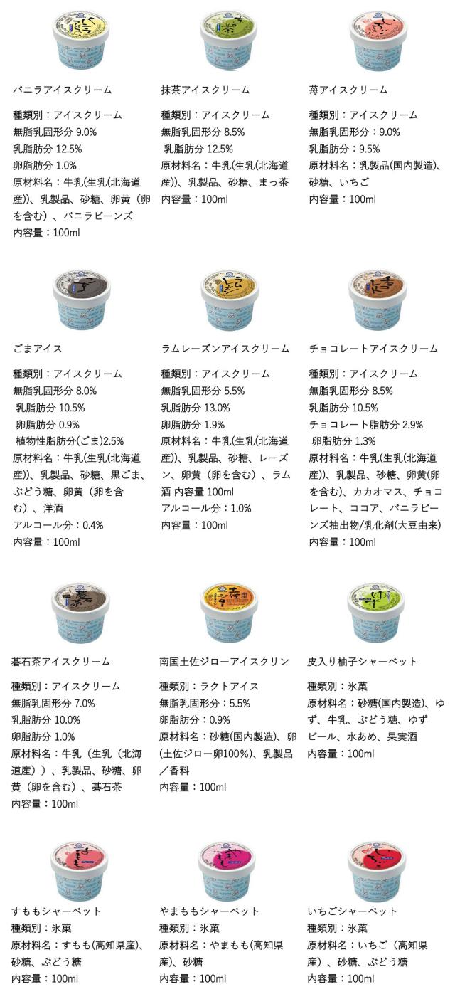 | セット内容 | バニラアイスクリーム 抹茶アイスクリーム ラムレーズンアイスクリーム チョコレートアイスクリーム 碁石茶アイスクリーム いちごアイスクリーム ごまアイス いちごシャーベット すももシャーベット やまももシャーベット 柚子シャーベット 南国土佐ジローアイスクリン |