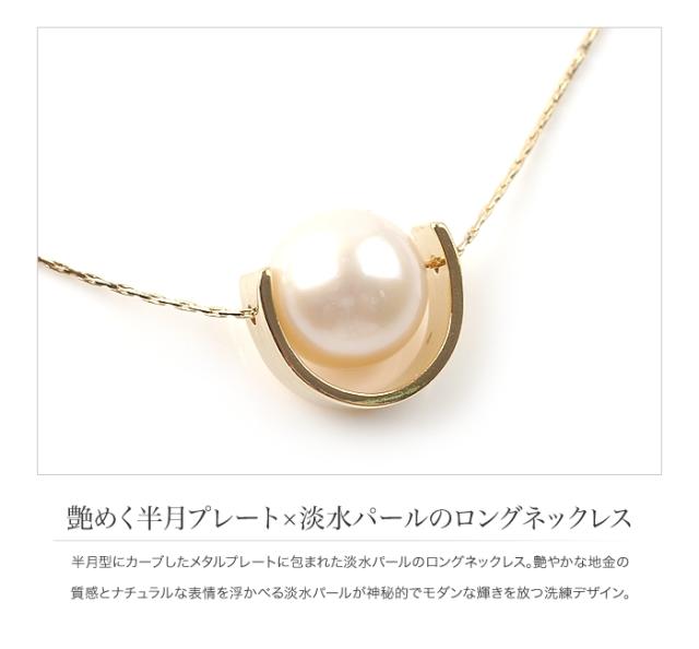 半月型にカーブしたメタルプレートに包まれた淡水パールのロングネックレス。