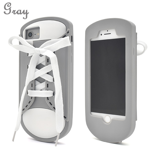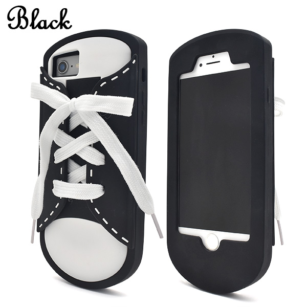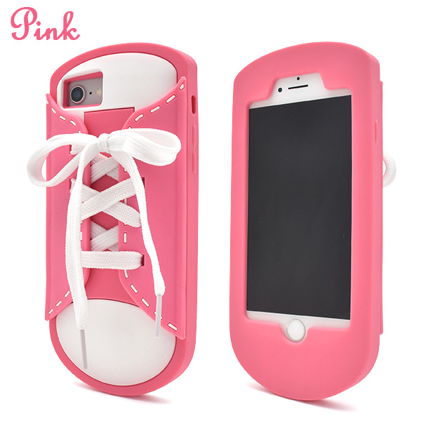 iPhone6/iPhone6s/iPhone8/iPhone7/iPhoneSE(第2世代・第3世代)共通で使えるシリコンケースです。ブラック/グレー/ピンクの3色展開です。どのカラーでも、白の靴紐が付属します。