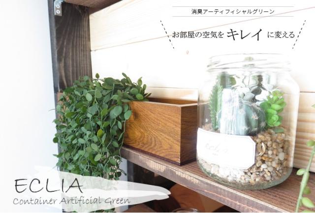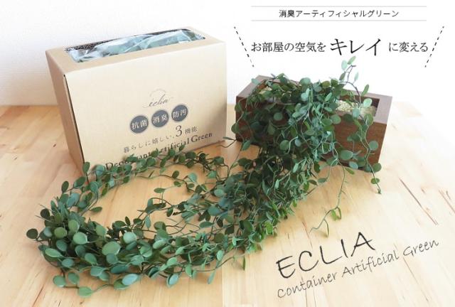 エクリアのコンテナタイプは掛けても、置いても使える2way仕様!大人の色合いの木目調ボックスにボリュームのあるグリーンがとてもおしゃれ、お部屋のインテリアのアクセントに飾ってみるとカフェ風インテリアに早変わりです。オシャレなだけでなく機能面にもCT触媒加工を施している消臭アーティフィシャルグリーンシリーズ。