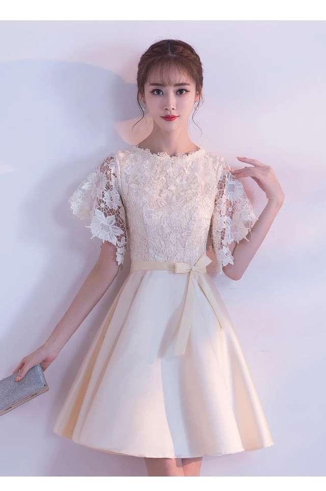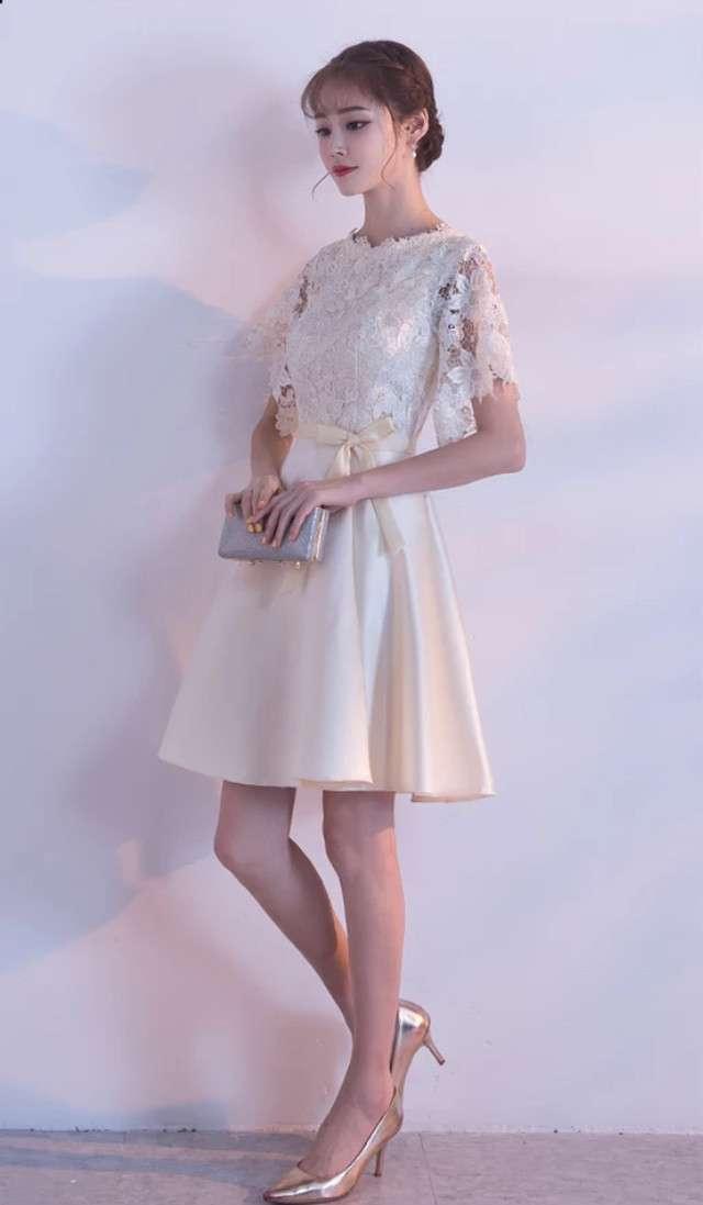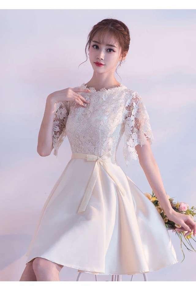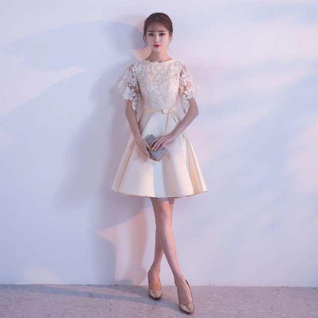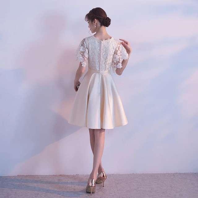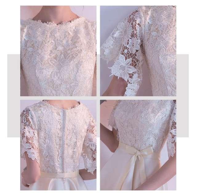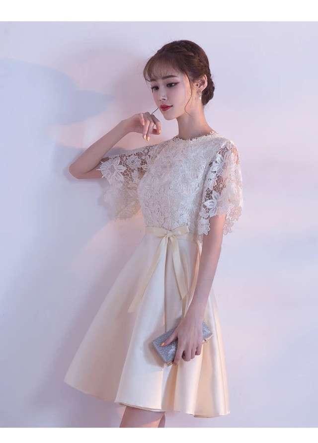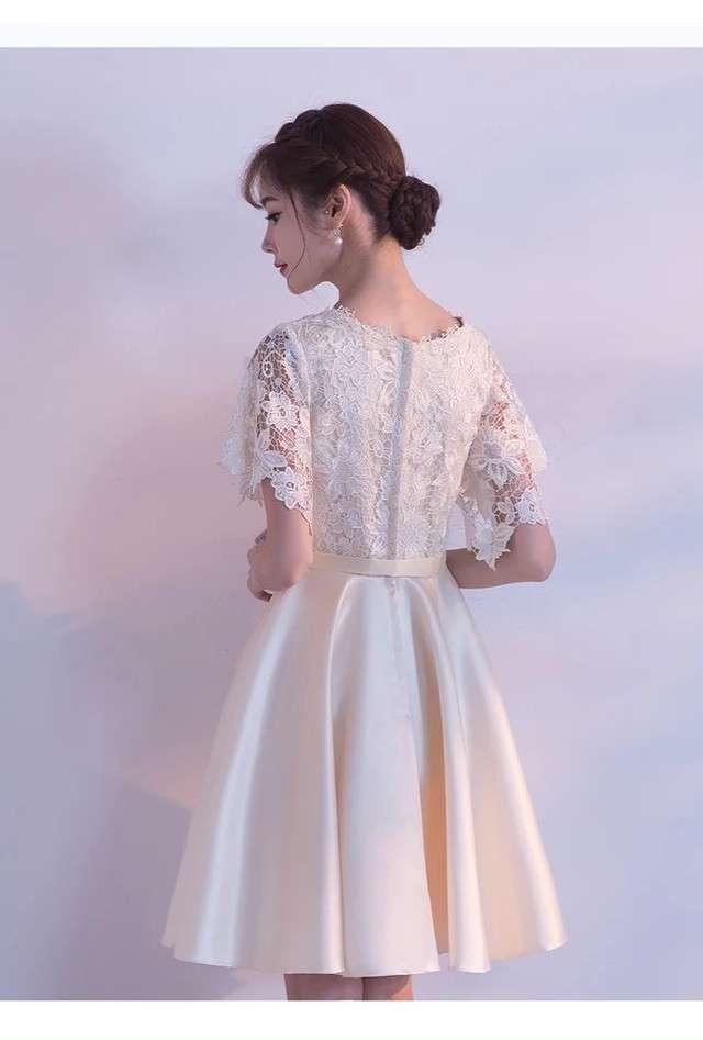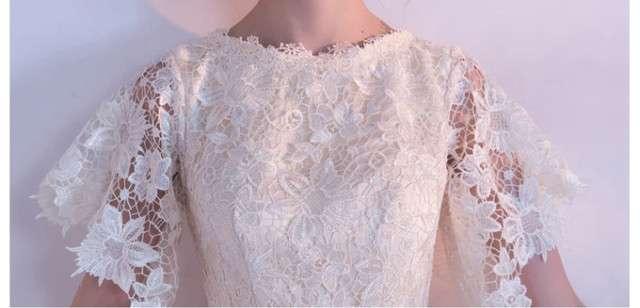即納あり パーティドレス 春夏 結婚式 大きいサイズ 20代 ミニ丈 半袖 袖あり クルーネック レース 花柄 刺繍 Xライン ガーリー