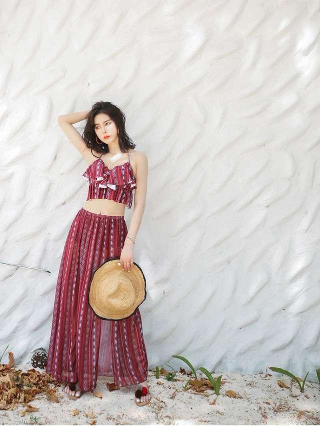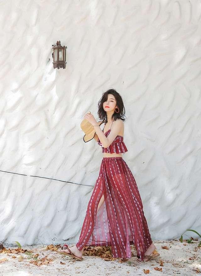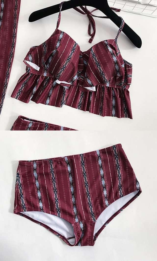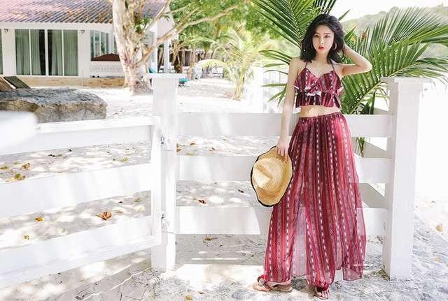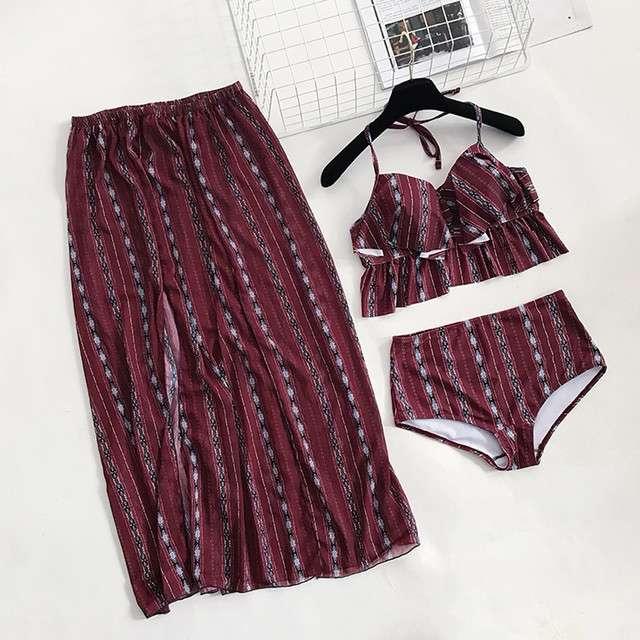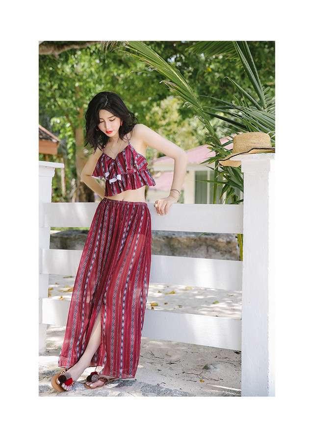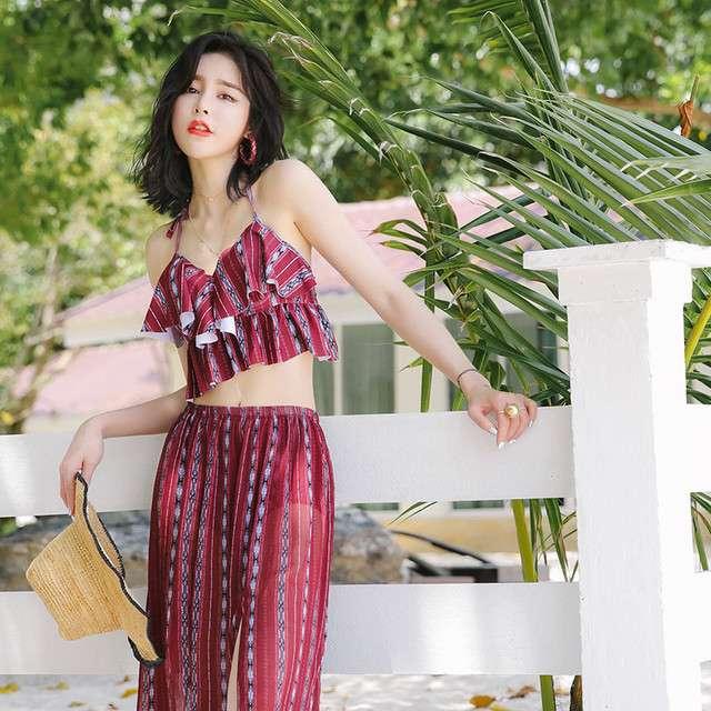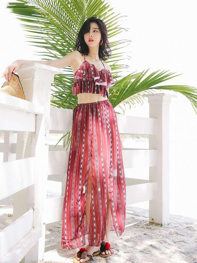 体型カバー 水着 ビキニ 3点セット 大きいサイズ レディース 2019年新作 ビーチウェア 40代 30代 フレアスカート スリット フリル セットアップ ボタニカル柄 シフォン 透け感 エスニック 着やせ 韓国 ママ オシャレ XL 海 プール リゾート ビーチ