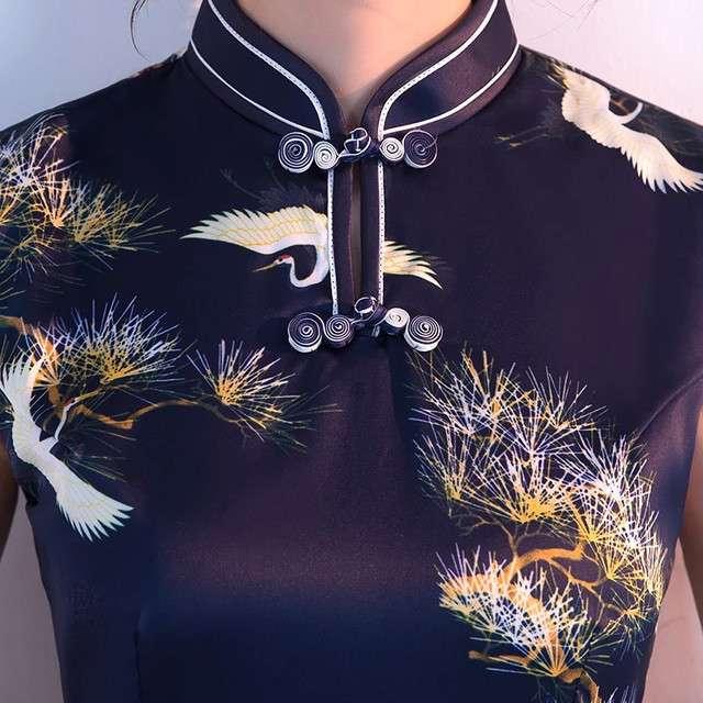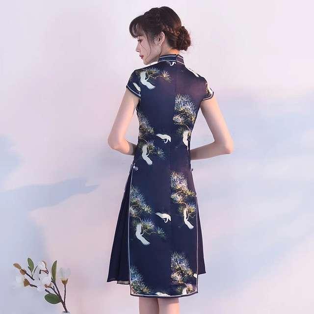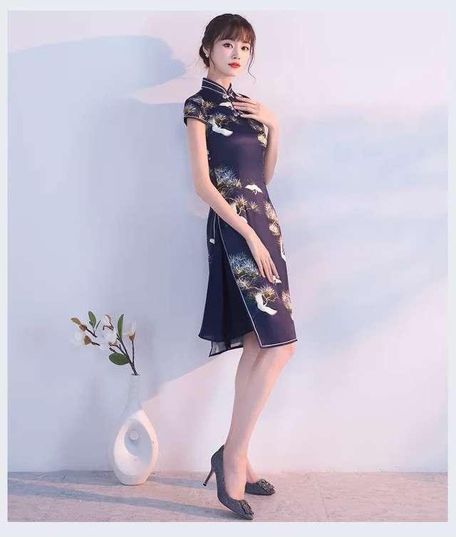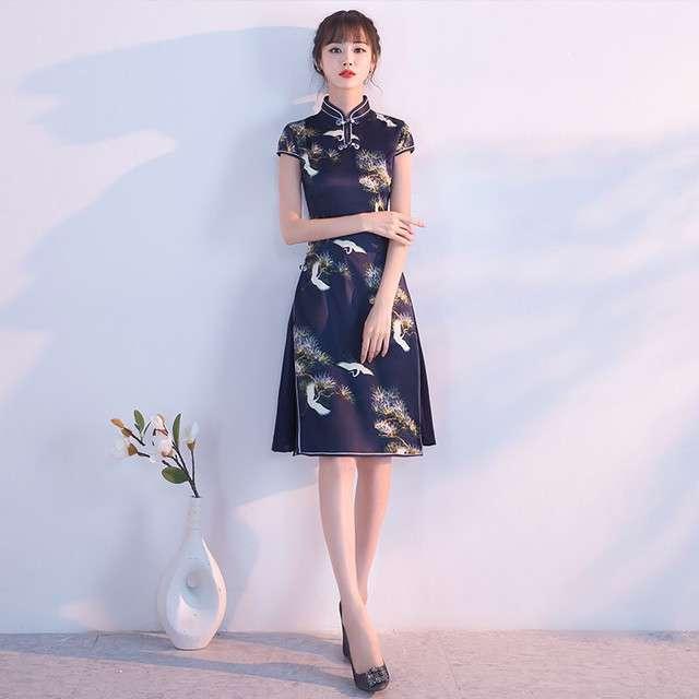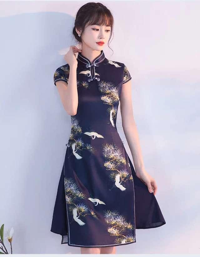 パーティドレス 二次会 お呼ばれ 謝恩会 ネイビー 大きいサイズ ゆったり大きいサイズ ひざ丈 半袖 袖あり Aライン タイト 着痩せ 個性的 ハイネック 20代 30代 春 夏 大人可愛い チャイナ スリット 女子会 和柄 セクシー 鶴 松 インスタ お洒落 キャバドレス