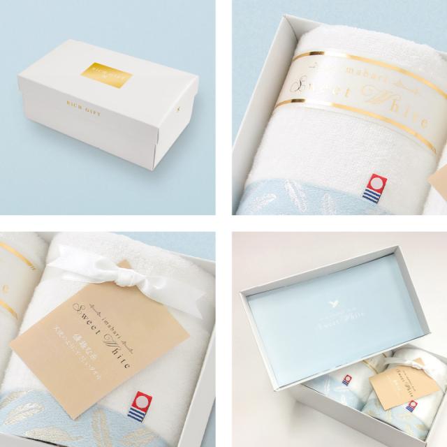こちらのふわふわ純白のタオルは、艶のある真っ白なボックス入り。細部にまでこだわったボックスで、あなたのきもちをしっかりとお届けします。