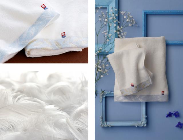 ふわりと舞う羽根がキラリと光るしっとりなめらかなこのタオルは、世界に誇るメイドインジャパン「今治タオルブランド」が認めたもの。こだわりはタオルだけに留まらず、「パッケージ」も美しい仕上がりに。