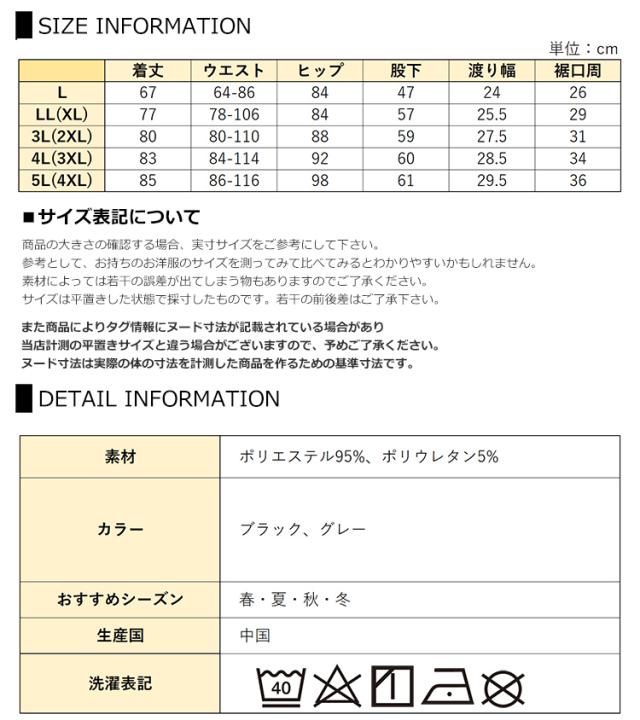5L(4XL):総丈85 ウエスト86-116 ヒップ98 股下61 渡り幅59 裾口周36