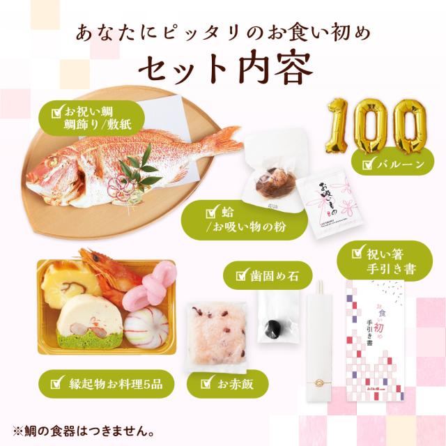 | 原材料 | ●鯛:愛媛県宇和海産養殖真鯛、食塩 ●縁起物お料理5品:別資料参照 ●赤飯[小豆]:もち米(国産)、小豆(国産)、食塩、着色料 ●赤飯[甘納豆]:もち米(国産)、甘納豆[砂糖、小豆(国産)、還元水飴]、食塩、着色料 ●蛤:千葉県九十九里産はまぐり1粒約35g ●お吸い物:約2.5g、食塩、麩、ねぎ、のり、調味料(アミノ酸等)、香料 ●歯固め石:新那智黒石(自然玉)磨きタイプ 約3〜4cm ※天然石の為大きさや形に個体差があります。 ●祝箸:【箸袋】無蛍光奉書/【箸】国産柳 ●100日バルーンセット:アルミ |