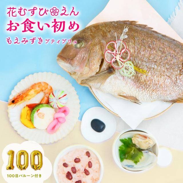 お食い初め セット 【花むすび・えん お食い初め膳 -もえみずきプティ プリュ-(100日バルーン付き・鯛1.5kg)】 これ1つで簡単本格お食い初め 国産最高級ブランド真鯛 料理 歯固め石 出産祝い