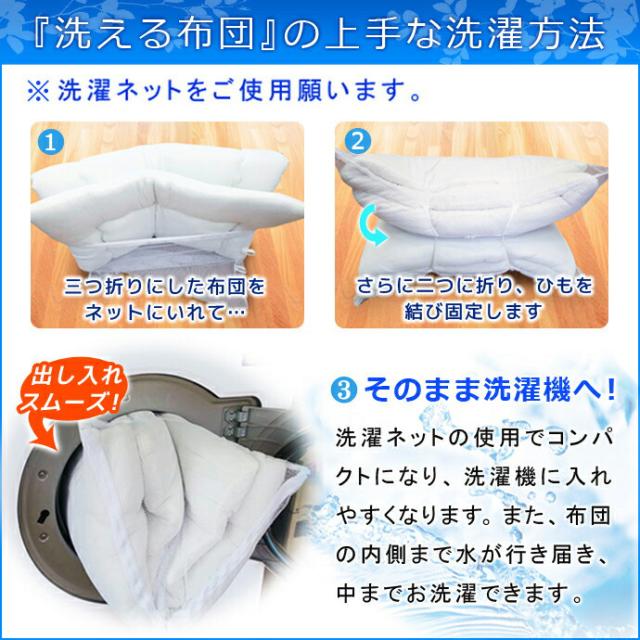 ・布団は御使用前に数時間の天日干しをおすすめ致します。また布団は長時間御使用していくうえで多少のへたり感が御座いますが、布団を丸洗いすると中綿が復元しボリューム感が御座います。【洗える布団】