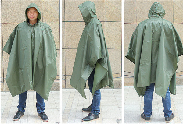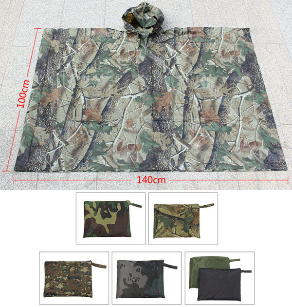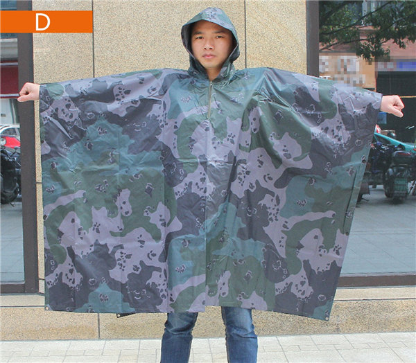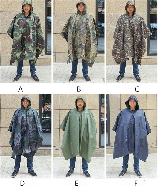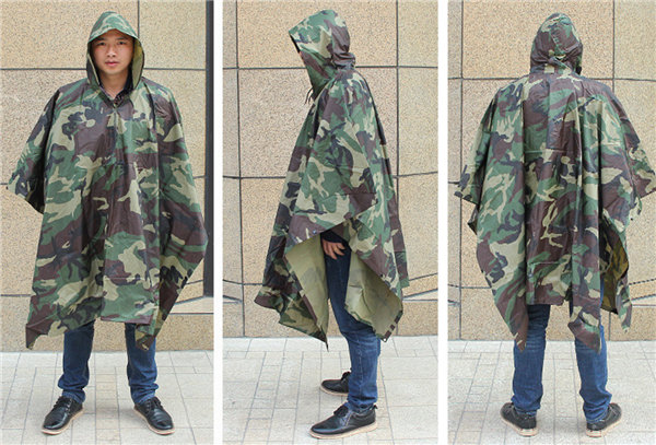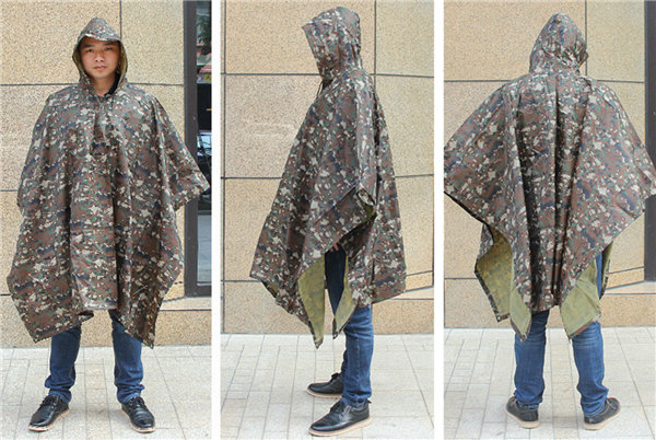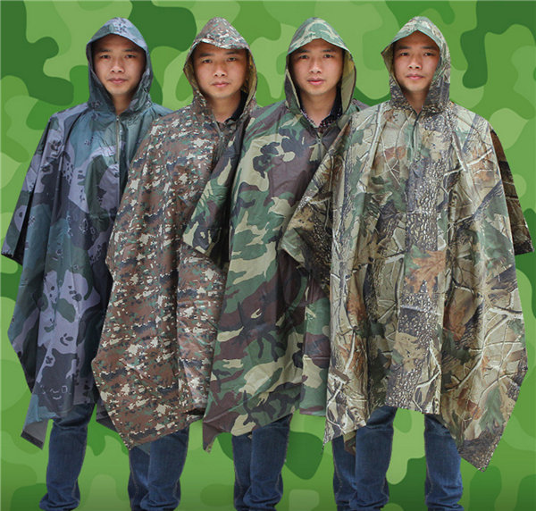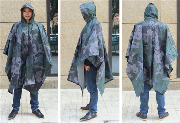 迷彩柄のフード付きレインポンチョです。
