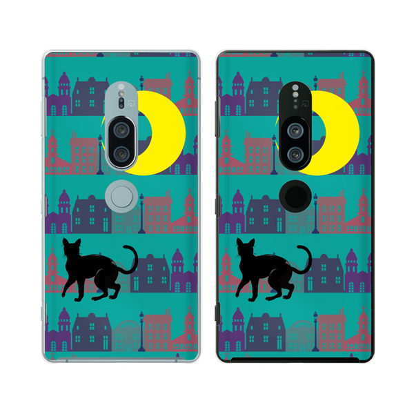 Xperia XZ2 Premium (docomo SO-04K / au SOV38) (純正卓上充電対応) スマホ ケース カバー 街 月 猫 グリーン