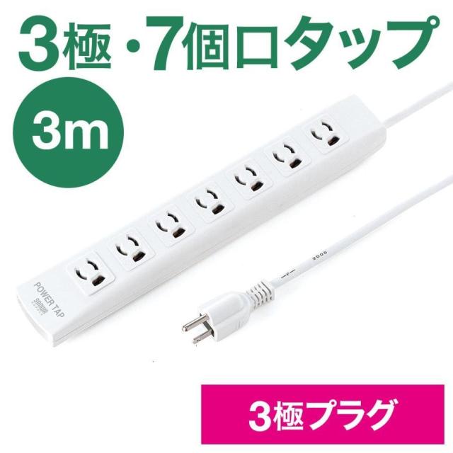 電源タップ 抜け止め3Pコンセント 7個口 3m 3P電源プラグ 固定用マグネット 雷ガード [700-TAP039]